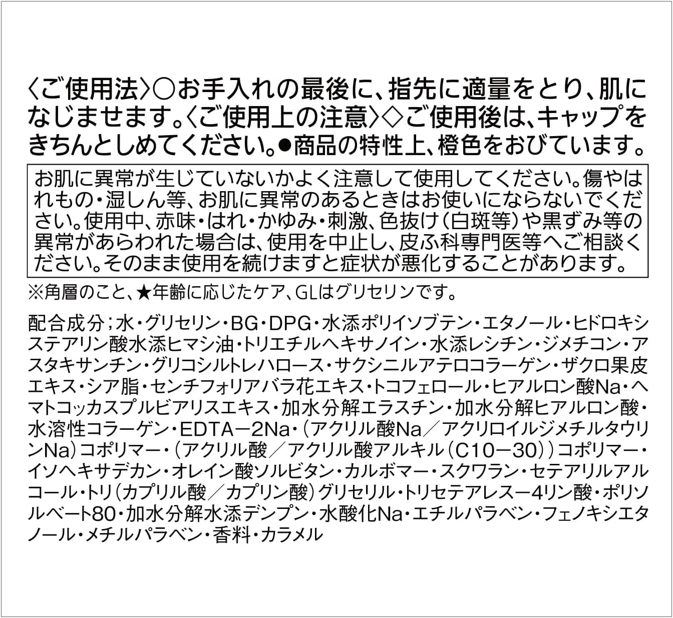 Water, Glycerin, BG, DPG, Hydraulic Polyisobutene, Ethanol, Hydroxystyphosphate, Castor Oil, Triethylhexanoin, Hydrated Lecithin, Dimethicone, Astaxanthin, Glycosilrehalose, Succinylaterogen, Siacat, Ascorbic Acid Bill Centifolia Rose flower extract, tocopherol, tomato juice, sodium hyaluronate, hematococca purvialis extract, rose hip oil, wine, hydrolyzed hyaluronic acid, water-soluble collagen, EDTA-2Na, (sodium acrylic/acrylyl dimethyltaurine) copolymer (acrylic acid/alkyl acrylate (C10-3) 0)Copolymer Isohexadecane, Sorbitan Oleate, Carbomer, Squalane, Cetearyl Alcohol, Tri (Caprylic Acid/Capric Acid), Glyceryl, Tricetearas-4 Phosphate, Polysorbate 80, Hydrolyzed Starch, Sodium Hydroxide, Ethylparaben, Salicylic Acid, Phenoxyethano. Propylpara Ben, methylparaben, fragrance, caramel