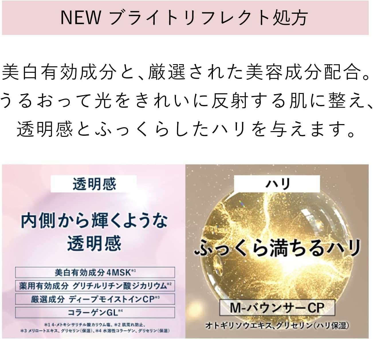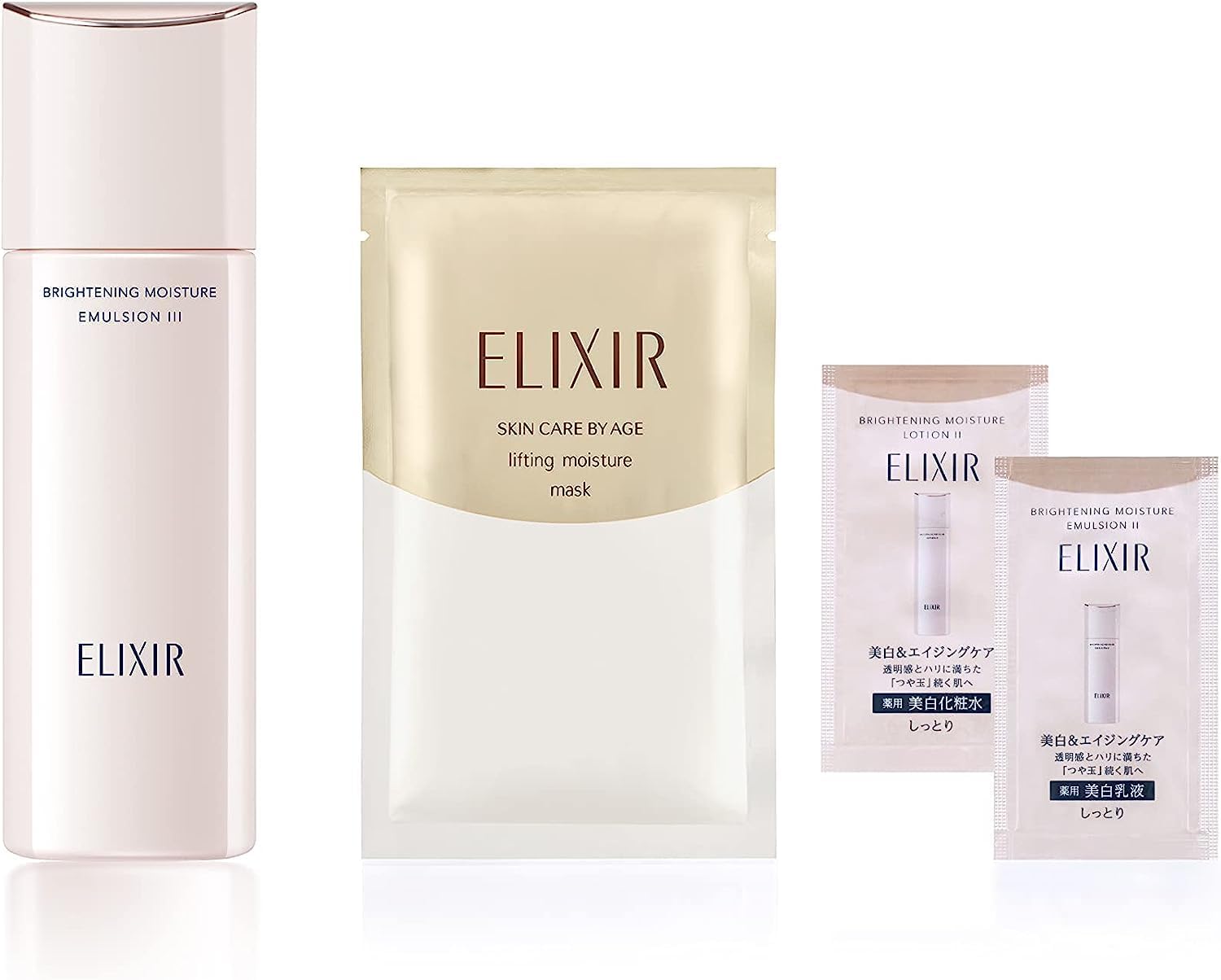 Sales Name: Elixir Brightening Emulsion WT 2 Whitening & Aging Care** For skin with transparency and crispness that will last through "gloss." Medicated whitening emulsion. The key to transparency is that your skin reflects light beautifully. Bright reflective formula with active whitening ingredients creates a sense of transparency, moisturized, light-reflecting skin In addition, the beauty ingredients are formulated to give your skin a plump and firmness. Eliminates small wrinkles from drying out. (effectiveness evaluation tested) *Reduces melanin production and prevents stains and freckles. *Moisturizing care for according to age