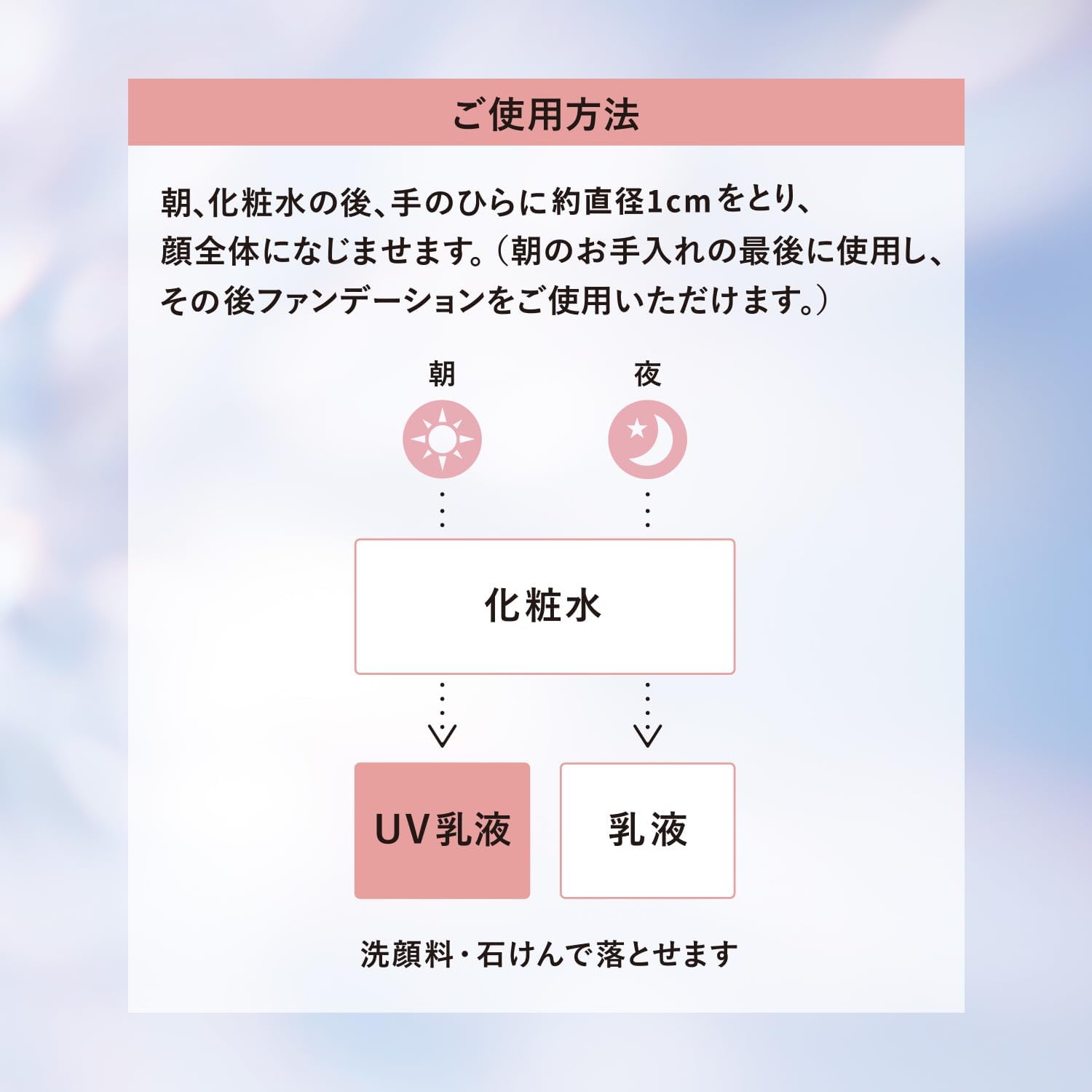 In the morning, after lotion, take about 1 cm in diameter into the palm of your hand, and make it fit your entire face. (Use it at the end of your morning care and then use the foundation. Low use will not provide adequate UV protection