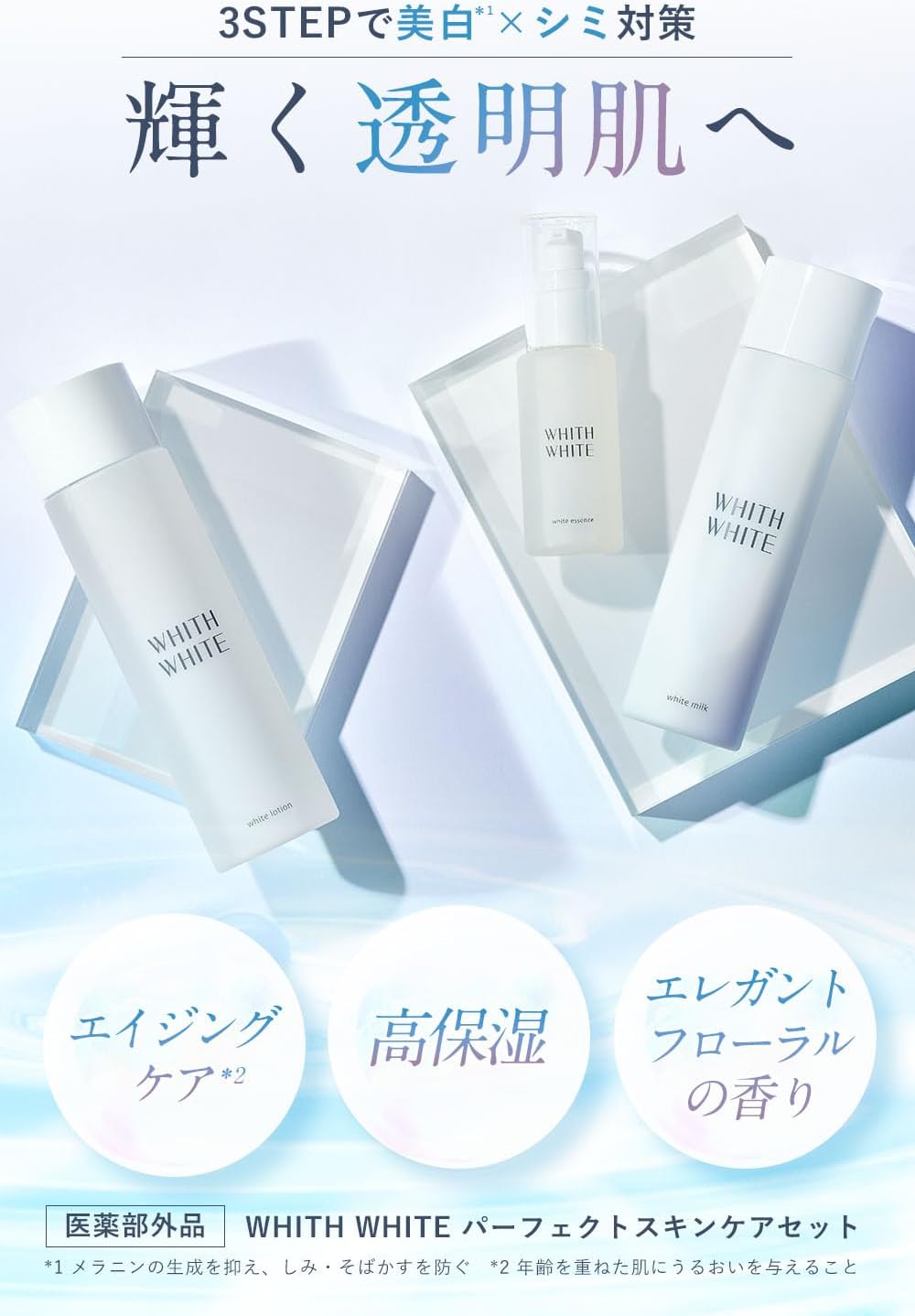 3-Step Luxury Set: From WHITH WHITE skin care products, this set includes 3 products of Cosmetics, 6.8 fl oz (200 ml), Serum 1.7 fl oz (50 ml), Milk Lotion 5.1 fl oz (150 ml)