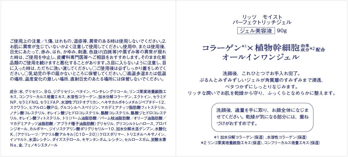 Water, glycerin, BG, diglycerin, betaine, pliers glycol, apple fruit culture cell extract, compfreecal culture extract, water-soluble collagen, hydrolyzed collagen, ectoin, ceramide NP, ceramide NG, ceramide AP, water-soluble proteteoglycan, hexacarboxymethylgypeptide-12, squirande-12, squirande-12, squirande-12, squirande-12, squirande-12, , hyaluronic acid. PG, glucocyl hesperidin, macademy nut fatty acid phytosteryl, cholesteryl nonanate, dihydrocholesteryl oleic acid, cholesteryl lactate, dihydrocholesteryl lactate, phytosteryl oleate, tri (palm oil fatty acids, palm nucleic fatty acids, olive oil acids, olive oil / macademiutes / macademiutic oil fatty oil fatty acids / macademiutic acid / macademiutic oil fatty oil fatty oil fatty acids / macademia num oils. / Abraana seed. Glyceryl, glycosiltrehalose, propandiol, carbomer, diisostearate polyglyceryl-10, hydrolyzed hydrated starch, potassium hydrooxide, (acrylate/alkyl acrylate (C10-30)), cross polymer, triethyl hexanoin, isomalt, water based lecithin, dyssterol, dyessterol, Suntan Gum, Reci Chin, Cellulose Gum, Sodium Carbonate, Gold, Phenoxyethanol